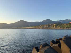 車が多数停まっているのは左端の突堤根本だが、混んでいるところは避けたいので右端の突堤は乗り込めないとかなんか事情があるのかと歩いて見に行ったところ車数台+釣り人1人見えたので戻って移動、右端突堤の根本に停めて歩いて突堤先端へ移動。