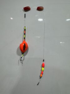 針側にはまず玉浮きを通す。浮力確保とアタリを見る用。でもそれだけだと投げウキも玉浮きもスルスルで動き放題、投げウキと玉浮きは離しておきたいのでそれぞれにウキ止めゴムを入れて動きを制限。