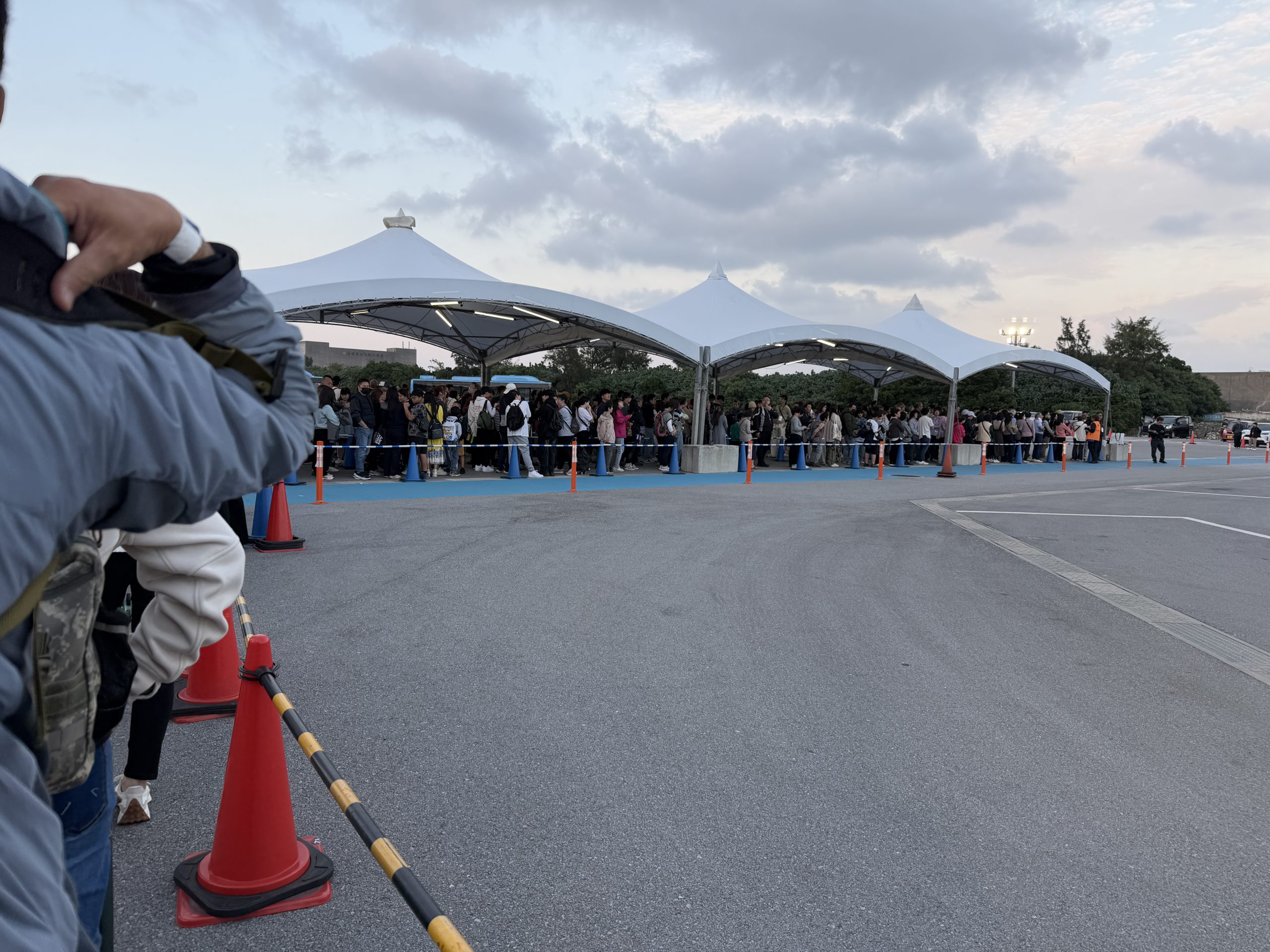 変わらず大行列。バスのほうがまだ捌けそうなのでバス行列で待つことにした。