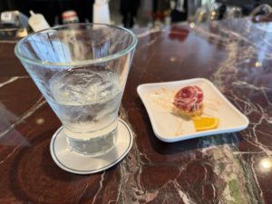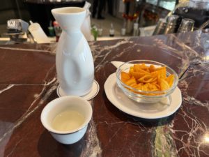 デッキ18のラウンジではなんか日系の酒類イベをやるらしくなんか準備していた。そこでせっかくなので日本の酒飲んでみることに。
