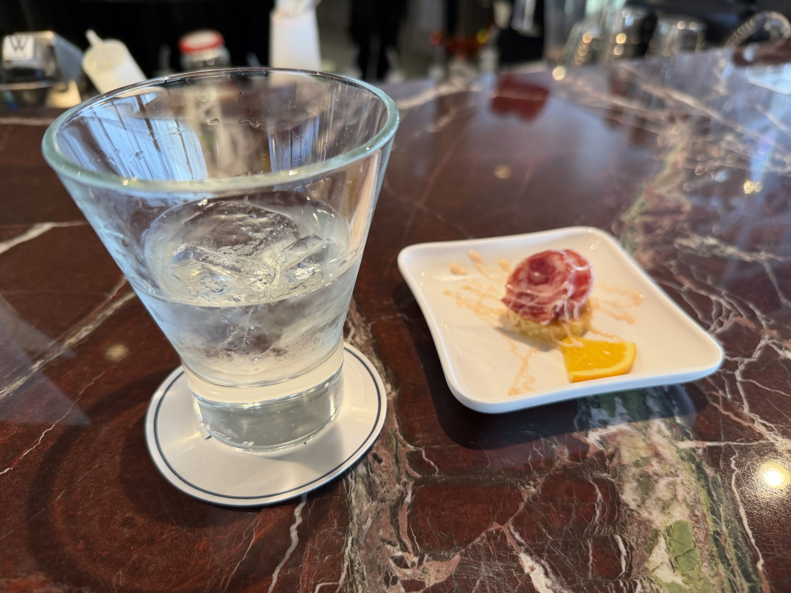 アテはちっこいパイにサラミが乗ったやつ。USD7に強制チップだのが乗って$10.35。