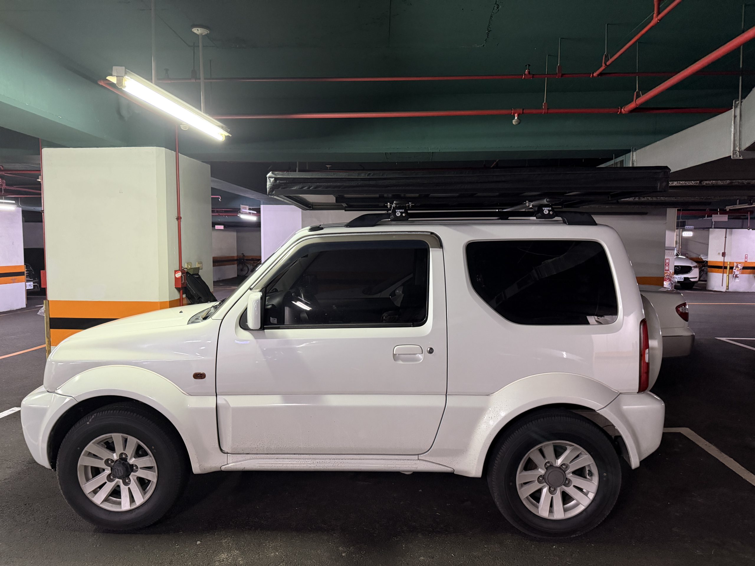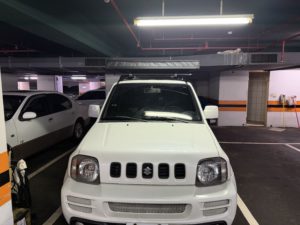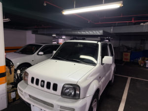 ところでこのページの製品/設置紹介ビデオ、ワシのJimnyそのものなんだが。以下に我が駐車場で撮った写真を挙げるが、このビデオのほうがモノはわかりやすいな。