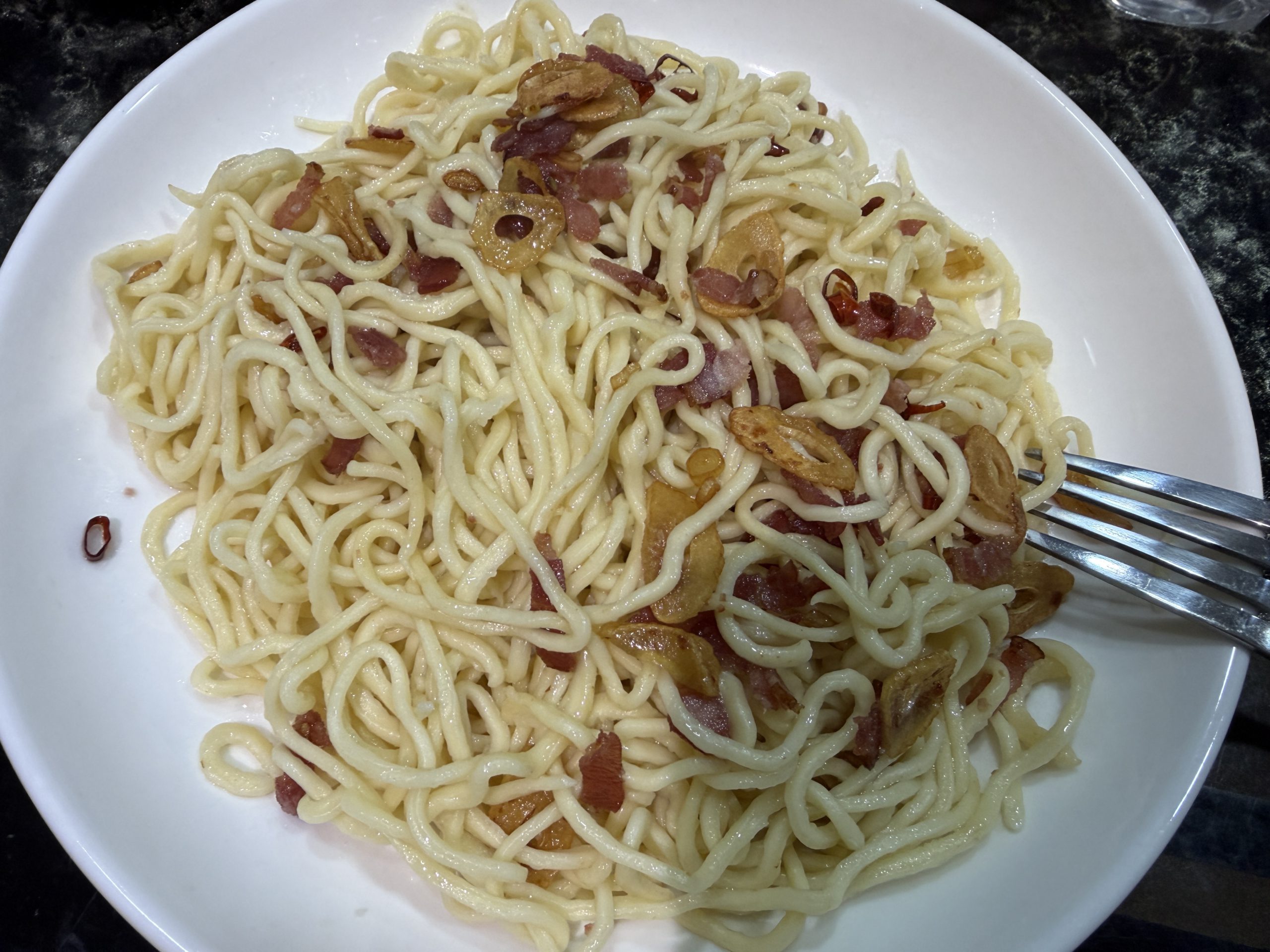 味はもちろんアーリオでオリオなペペロンチーノなんだが、食感がどうしたってラーメンだ。パスタは須らく乾麺買ってくれば宜し。