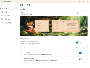 で、使ってみたところ画面中央にやたら邪魔なCopilotロゴが出ていて、まーどーせ設定とかで消すんぢゃろ、と右クリックしてSettingsに行ってみたら、コレ古のOfficeにあったデスクトップマスコットであった。