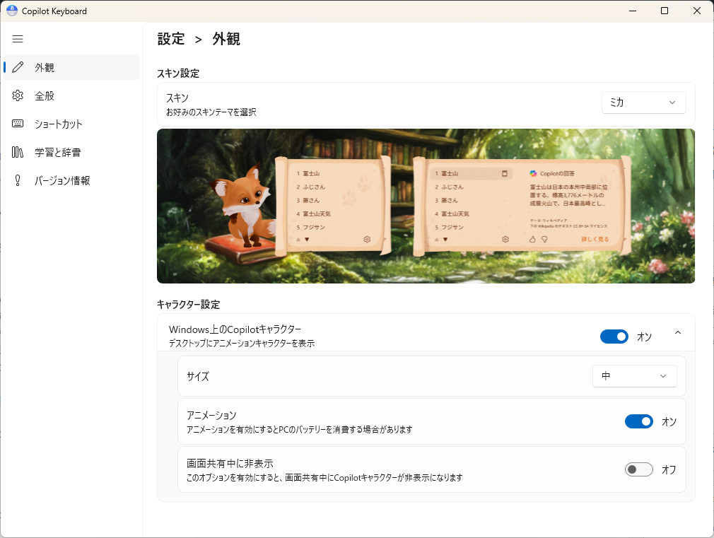 なおその”ミカ”のデスクトップマスコットを左クリックするとCopilotのChat窓は出てきてAI会話ができるのだが、その声がなんともおかしい。10種くらい選べるが全部おかしい。